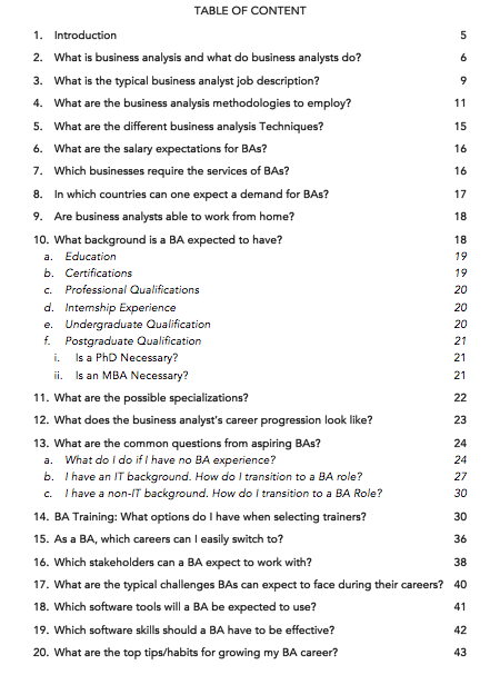 This eBook is organized into 20 questions, each answered in a way that is accessible even to complete newcomers to the world of business analysis while at the same time providing professional insight to seasoned business analysts.